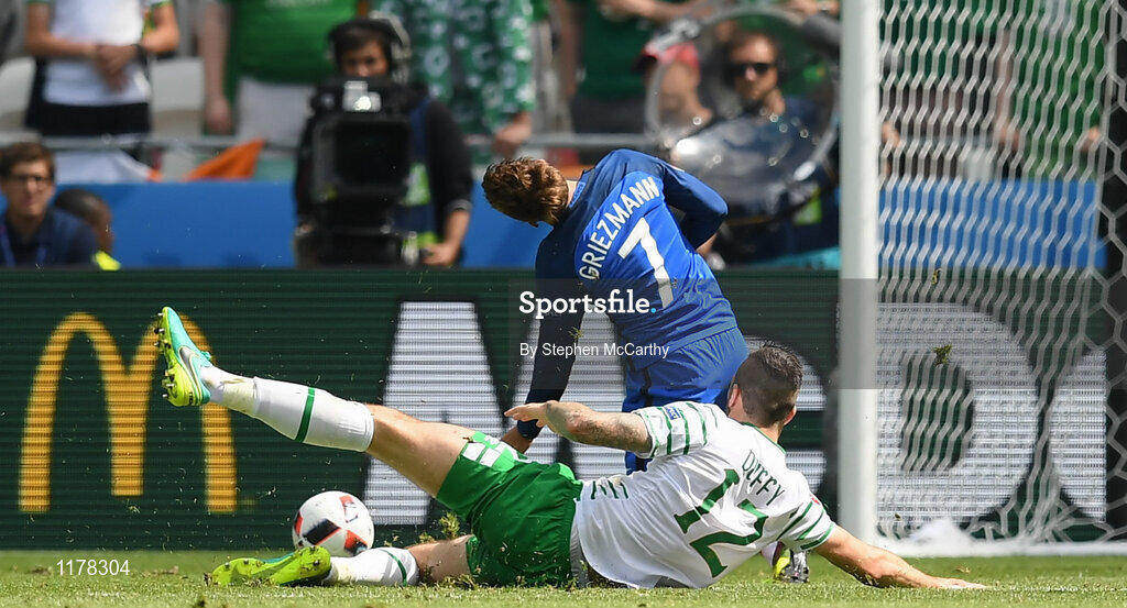 26 June 2016; Shane Duffy of Republic of Ireland fouls Antoine Griezmann of France during the UEFA Euro 2016 Round of 16 match between France and Republic of Ireland at Stade des Lumieres in Lyon, France. Photo by Stephen McCarthy/Sportsfile