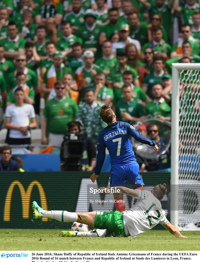 26 June 2016; Shane Duffy of Republic of Ireland fouls Antoine Griezmann of France during the UEFA Euro 2016 Round of 16 match between France and Republic of Ireland at Stade des Lumieres in Lyon, France. Photo by Stephen McCarthy/Sportsfile