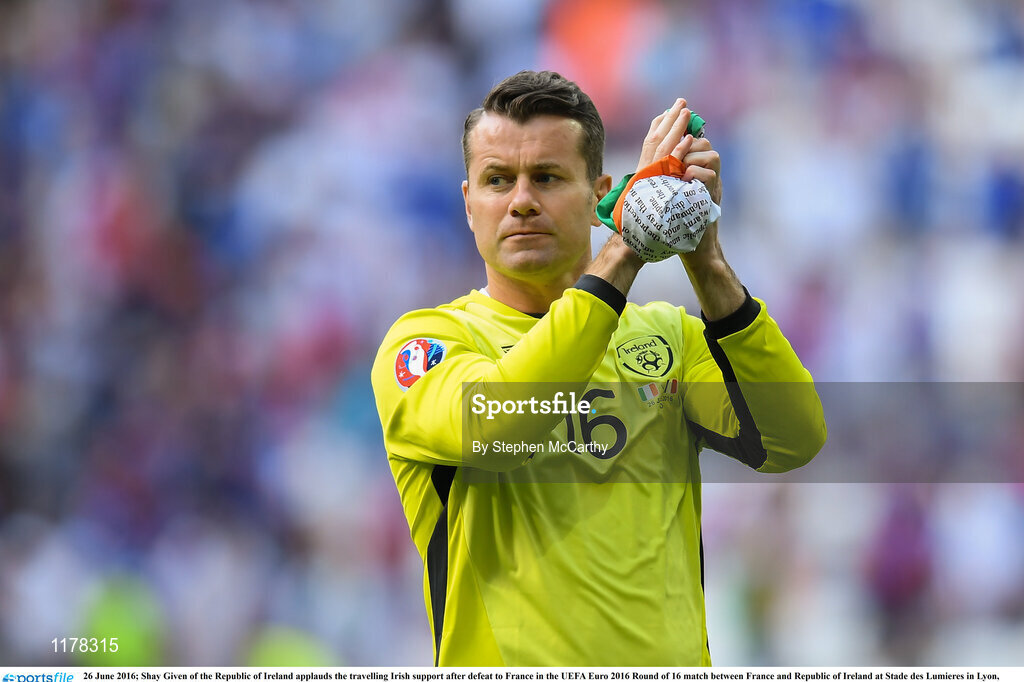 26 June 2016; Shay Given of the Republic of Ireland applauds the travelling Irish support after defeat to France in the UEFA Euro 2016 Round of 16 match between France and Republic of Ireland at Stade des Lumieres in Lyon, France. Photo by Stephen McCarthy/Sportsfile