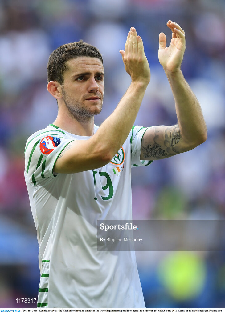 26 June 2016; Robbie Brady of the Republic of Ireland applauds the travelling Irish support after defeat to France in the UEFA Euro 2016 Round of 16 match between France and Republic of Ireland at Stade des Lumieres in Lyon, France. Photo by Stephen McCarthy/Sportsfile