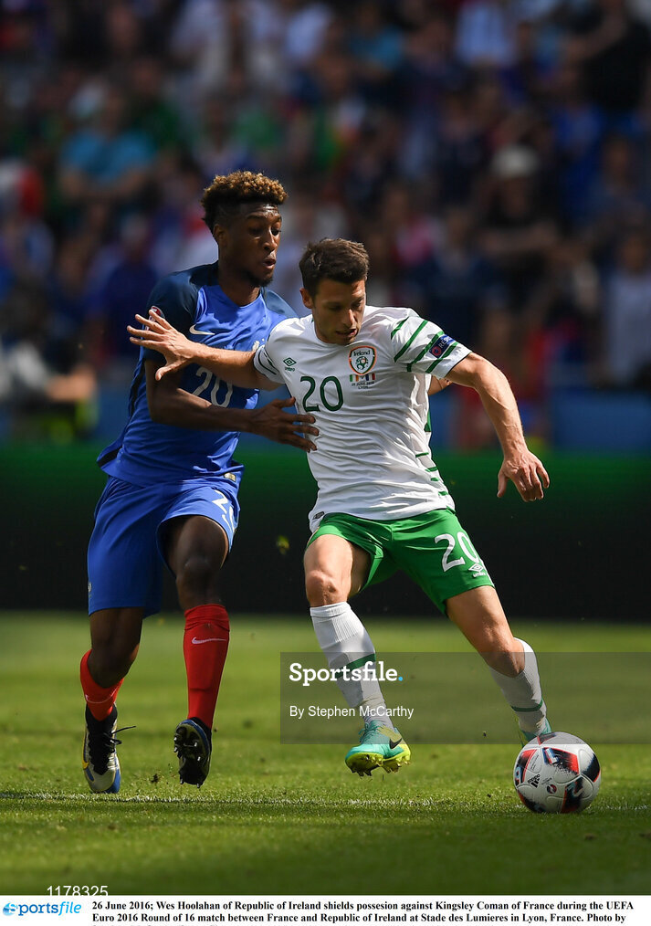 26 June 2016; Wes Hoolahan of Republic of Ireland shields possession against Kingsley Coman of France during the UEFA Euro 2016 Round of 16 match between France and Republic of Ireland at Stade des Lumieres in Lyon, France. Photo by Stephen McCarthy/Sportsfile