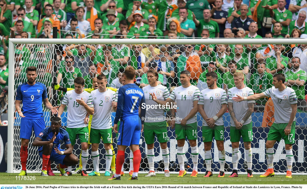 26 June 2016; Paul Pogba of France tries to disrupt the Irish wall at a French free kick during the UEFA Euro 2016 Round of 16 match between France and Republic of Ireland at Stade des Lumieres in Lyon, France. Photo by Stephen McCarthy/Sportsfile