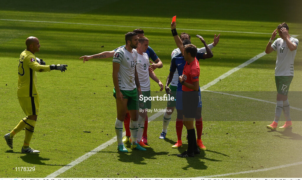 26 June 2016; Shane Duffy of Republic of Ireland receives a red card from referee Nicola Rizzoli of Italy during the UEFA Euro 2016 Round of 16 match between France and Republic of Ireland at Stade des Lumieres in Lyon, France. Photo by Ray McManus/Sportsfile