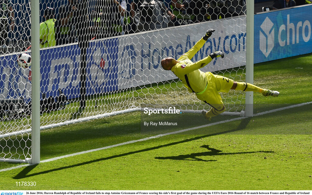 26 June 2016; Darren Randolph of Republic of Ireland fails to stop Antoine Griezmann of France scoring his side's first goal of the game during the UEFA Euro 2016 Round of 16 match between France and Republic of Ireland at Stade des Lumieres in Lyon, France. Photo by Ray McManus/Sportsfile