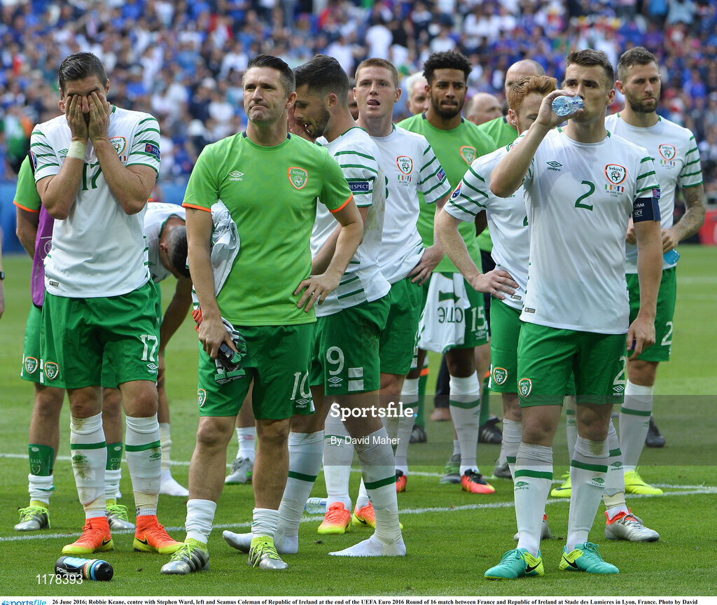 26 June 2016; Robbie Keane, centre with Stephen Ward, left and Seamus Coleman of Republic of Ireland at the end of the UEFA Euro 2016 Round of 16 match between France and Republic of Ireland at Stade des Lumieres in Lyon, France. Photo by David Maher/Sportsfile