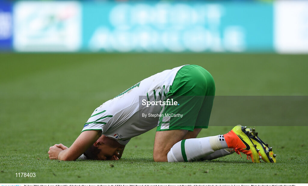 26 June 2016; Shane Long of Republic of Ireland after a heavy challenge in the UEFA Euro 2016 Round of 16 match between France and Republic of Ireland at Stade des Lumieres in Lyon, France. Photo by Stephen McCarthy/Sportsfile