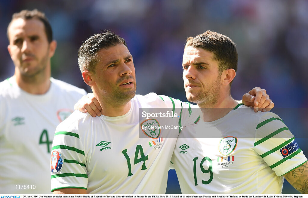 26 June 2016; Jon Walters consoles teammate Robbie Brady of Republic of Ireland after the defeat to France in the UEFA Euro 2016 Round of 16 match between France and Republic of Ireland at Stade des Lumieres in Lyon, France. Photo by Stephen McCarthy/Sportsfile