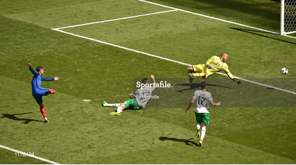 26 June 2016; Antoine Griezmann of France scores his side's second goal of the game in the UEFA Euro 2016 Round of 16 match between France and Republic of Ireland at Stade des Lumieres in Lyon, France. Photo by Sportsfile