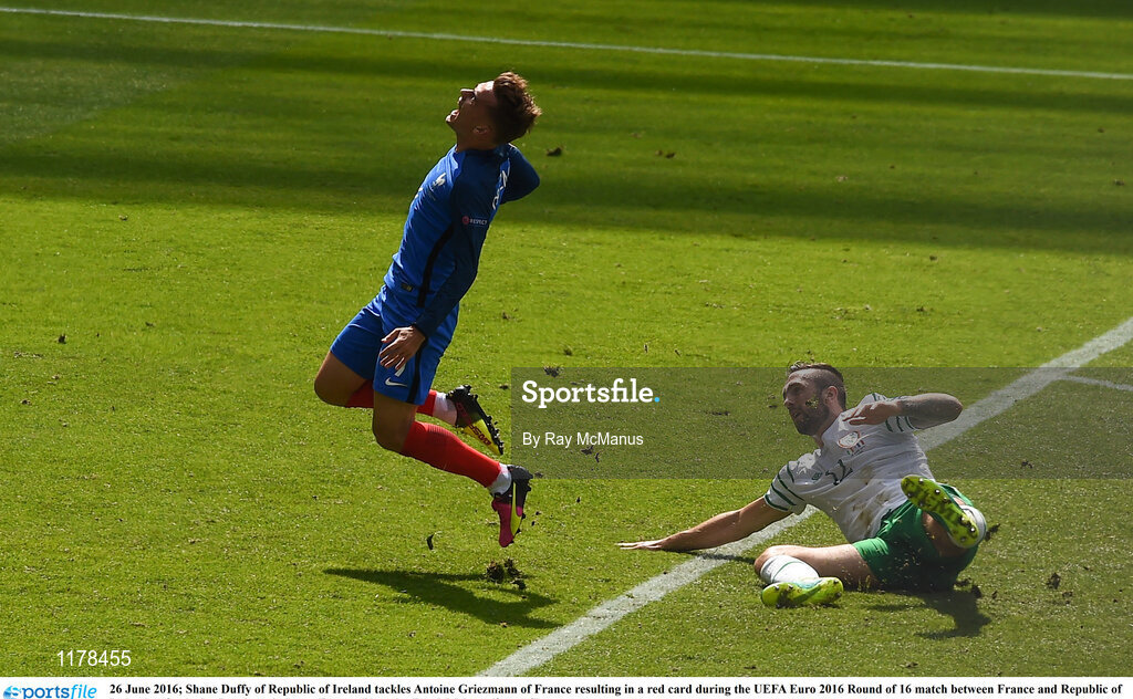 26 June 2016; Shane Duffy of Republic of Ireland tackles Antoine Griezmann of France resulting in a red card during the UEFA Euro 2016 Round of 16 match between France and Republic of Ireland at Stade des Lumieres in Lyon, France. Photo by Ray McManus/Sportsfile