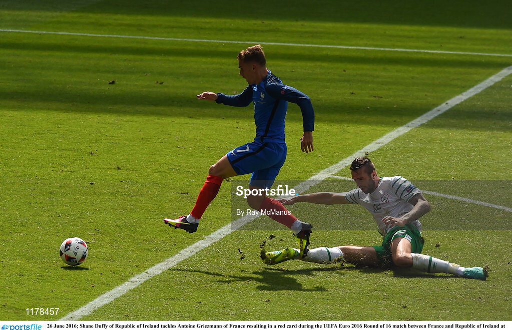 26 June 2016; Shane Duffy of Republic of Ireland tackles Antoine Griezmann of France resulting in a red card during the UEFA Euro 2016 Round of 16 match between France and Republic of Ireland at Stade des Lumieres in Lyon, France. Photo by Ray McManus/Sportsfile