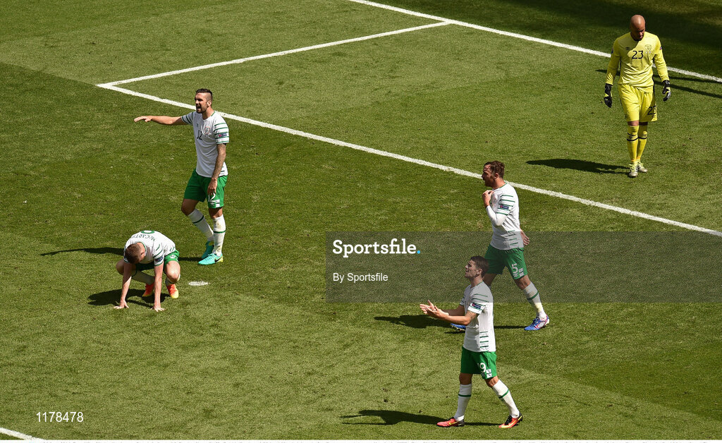 26 June 2016; Republic of Ireland's players, from left, James McCarthy, Shane Duffy, Robbie Brady and Richard Keogh dejected after France scored the equaliser in the UEFA Euro 2016 Round of 16 match between France and Republic of Ireland at Stade des Lumieres in Lyon, France. Photo by Sportsfile