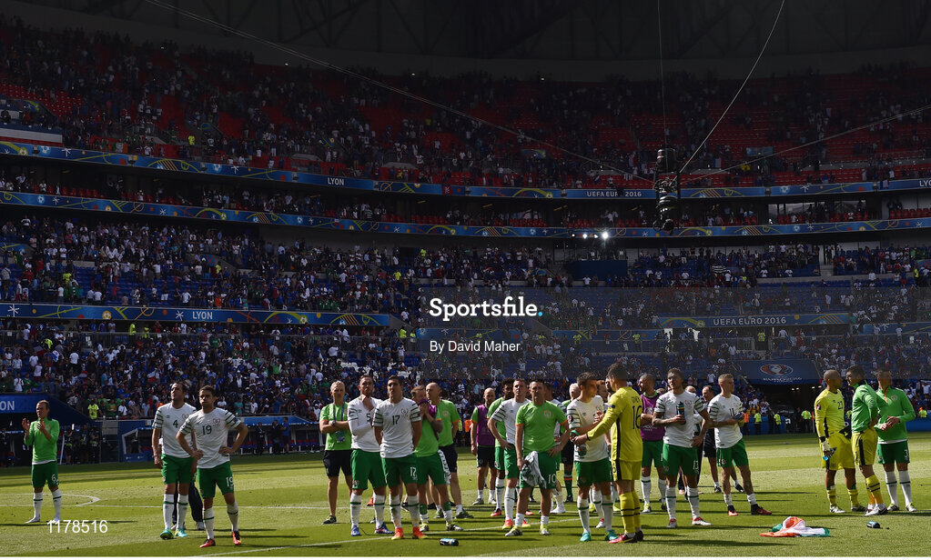 26 June 2016; Republic of Ireland players looking dejected on the pitch after defeat to France in the UEFA Euro 2016 Round of 16 match between France and Republic of Ireland at Stade des Lumieres in Lyon, France. Photo by David Maher/Sportsfile