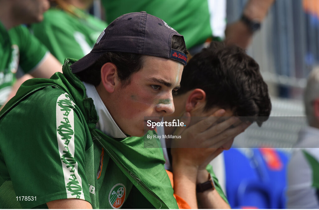26 June 2016; Republic of Ireland supporters wonder what might have been after defeat to France in the UEFA Euro 2016 Round of 16 match between France and Republic of Ireland at Stade des Lumieres in Lyon, France. Photo by Ray McManus/Sportsfile