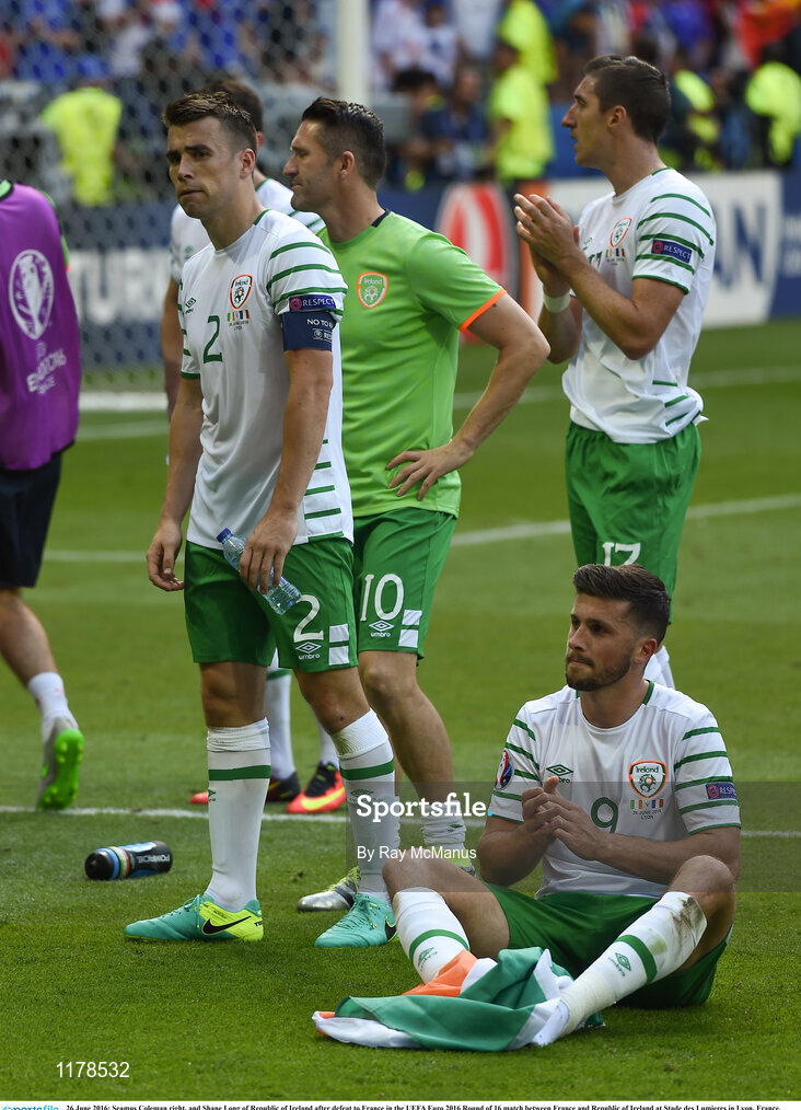 26 June 2016; Seamus Coleman right, and Shane Long of Republic of Ireland after defeat to France in the UEFA Euro 2016 Round of 16 match between France and Republic of Ireland at Stade des Lumieres in Lyon, France. Photo by Ray McManus/Sportsfile