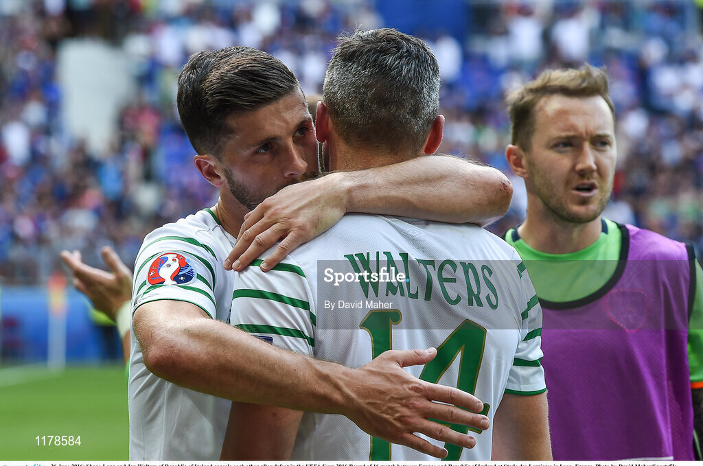 26 June 2016; Shane Long and Jon Walters of Republic of Ireland console each other after defeat in the UEFA Euro 2016 Round of 16 match between France and Republic of Ireland at Stade des Lumieres in Lyon, France. Photo by David Maher/Sportsfile