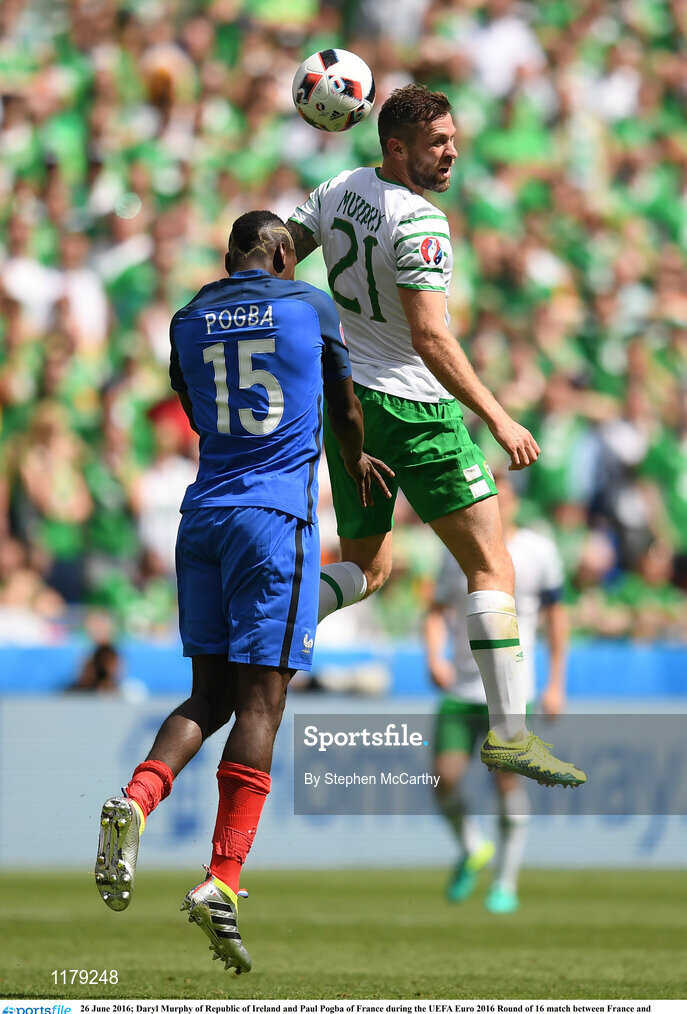 26 June 2016; Daryl Murphy of Republic of Ireland and Paul Pogba of France during the UEFA Euro 2016 Round of 16 match between France and Republic of Ireland at Stade des Lumieres in Lyon, France. Photo by Stephen McCarthy/Sportsfile