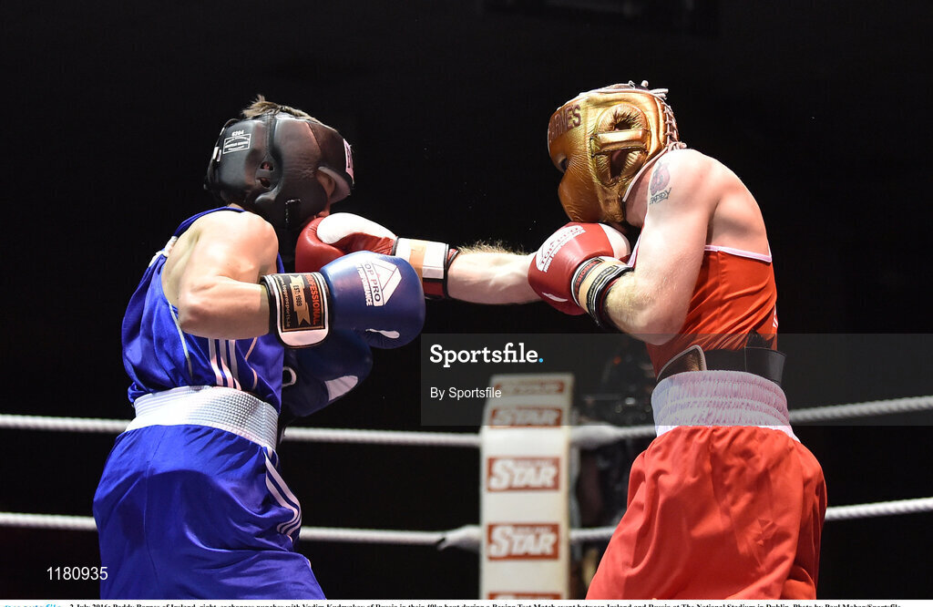 2 July 2016; Paddy Barnes of Ireland, right, exchanges punches with Vadim Kudryakov of Russia in their 49kg bout during a Boxing Test Match event between Ireland and Russia at The National Stadium in Dublin. Photo by Sportsfile