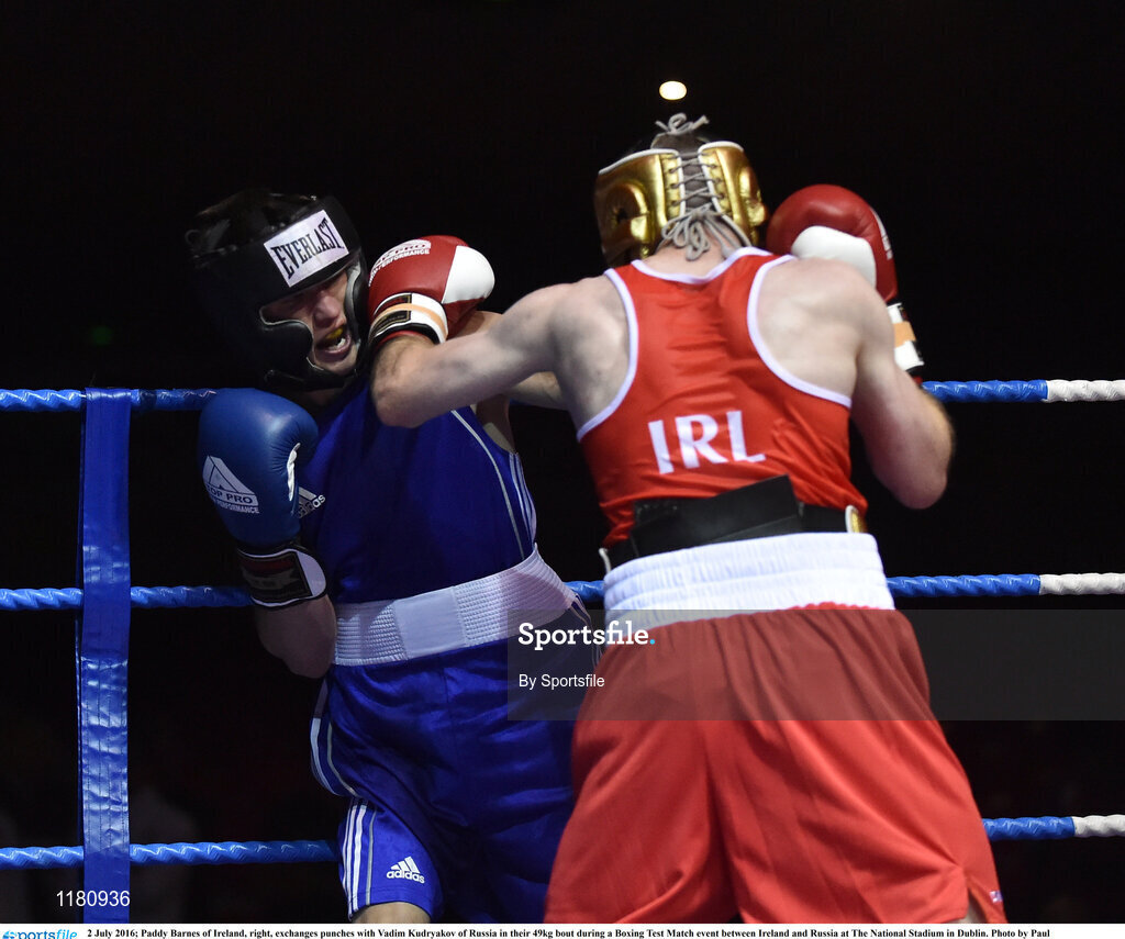 2 July 2016; Paddy Barnes of Ireland, right, exchanges punches with Vadim Kudryakov of Russia in their 49kg bout during a Boxing Test Match event between Ireland and Russia at The National Stadium in Dublin. Photo by Sportsfile