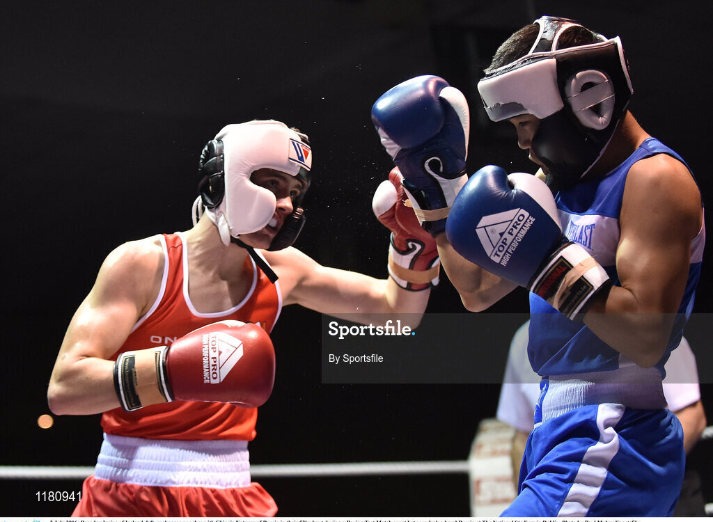 2 July 2016; Brendan Irvine of Ireland, left, exchanges punches with Chingiz Natyrov of Russia in their 52kg bout during a Boxing Test Match event between Ireland and Russia at The National Stadium in Dublin. Photo by Sportsfile