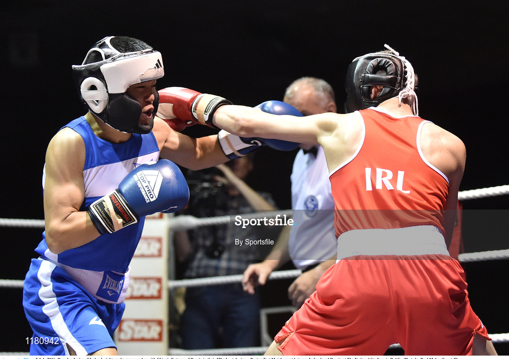 2 July 2016; Brendan Irvine of Ireland, right, exchanges punches with Chingiz Natyrov of Russia in their 52kg bout during a Boxing Test Match event between Ireland and Russia at The National Stadium in Dublin. Photo by Sportsfile