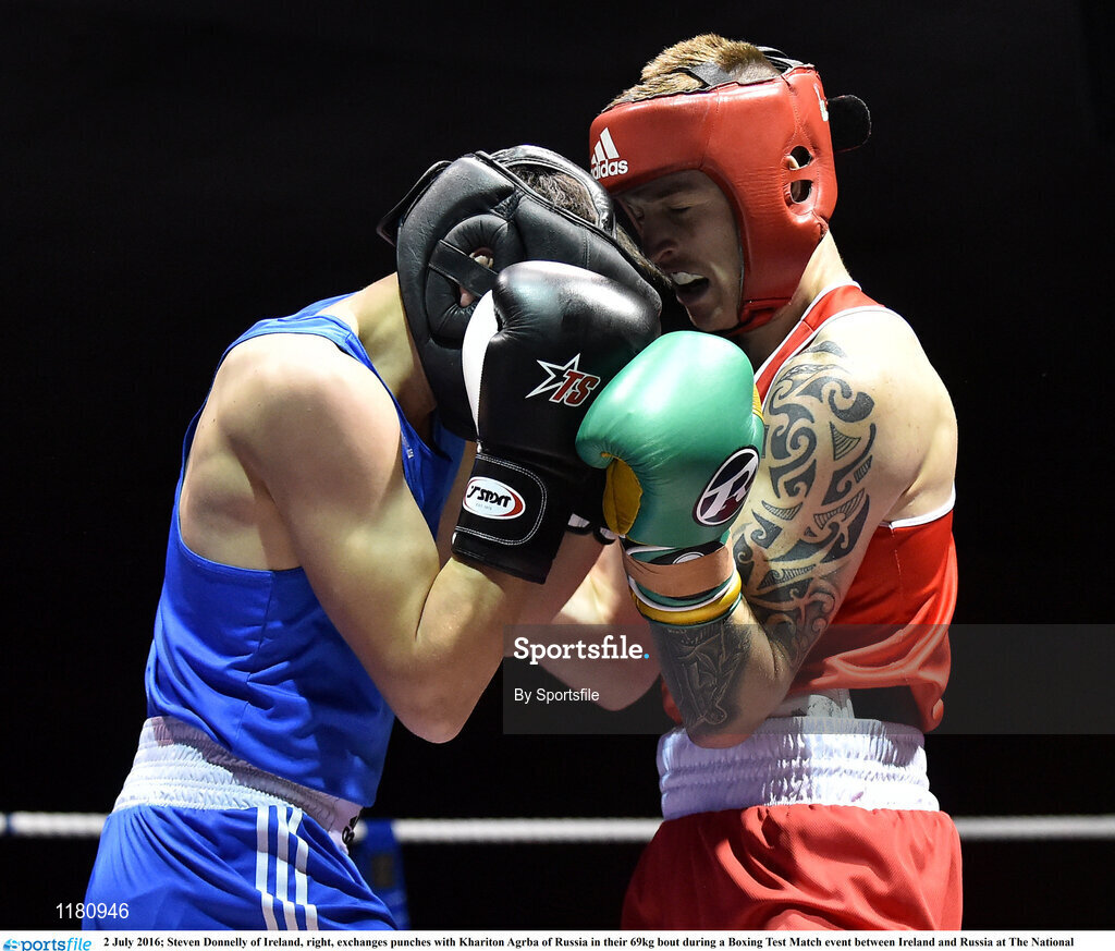 2 July 2016; Steven Donnelly of Ireland, right, exchanges punches with Khariton Agrba of Russia in their 69kg bout during a Boxing Test Match event between Ireland and Russia at The National Stadium in Dublin.Photo by Sportsfile