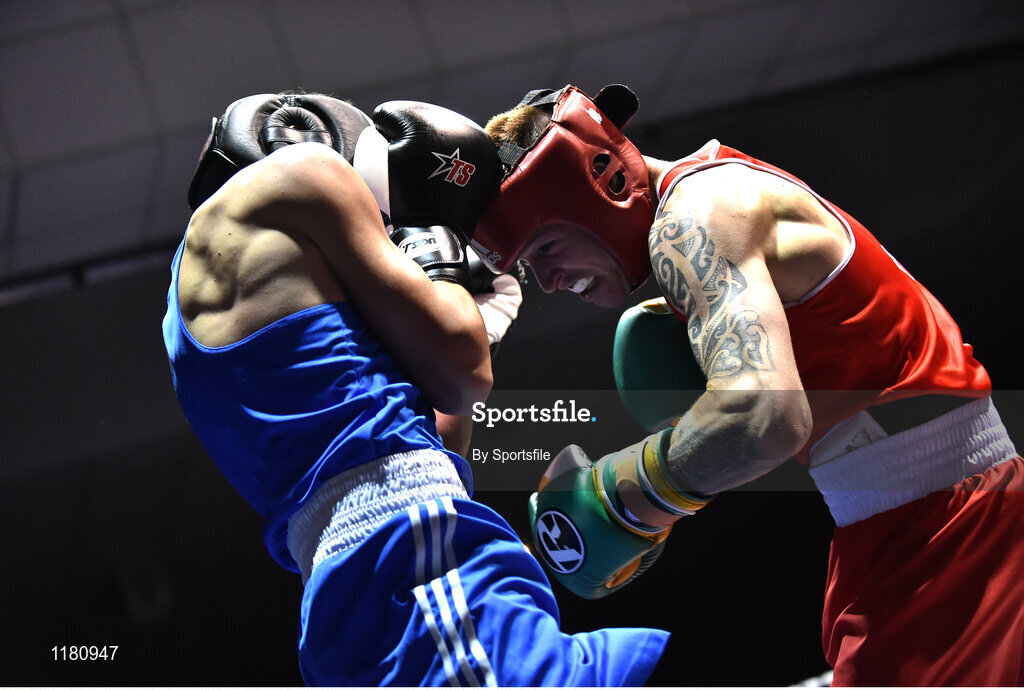 2 July 2016; Steven Donnelly of Ireland, right, exchanges punches with Khariton Agrba of Russia in their 69kg bout during a Boxing Test Match event between Ireland and Russia at The National Stadium in Dublin.Photo by Sportsfile