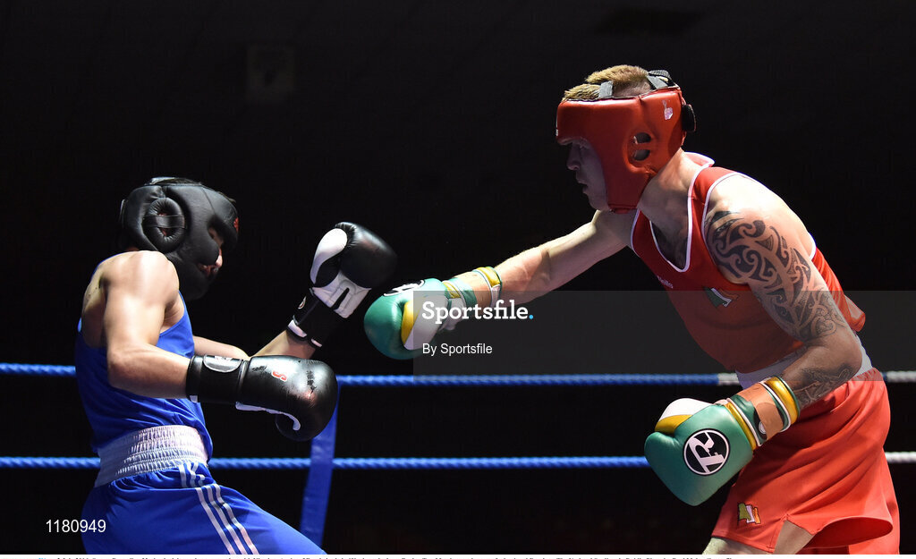 2 July 2016; Steven Donnelly of Ireland, right, exchanges punches with Khariton Agrba of Russia in their 69kg bout during a Boxing Test Match event between Ireland and Russia at The National Stadium in Dublin.Photo by Sportsfile