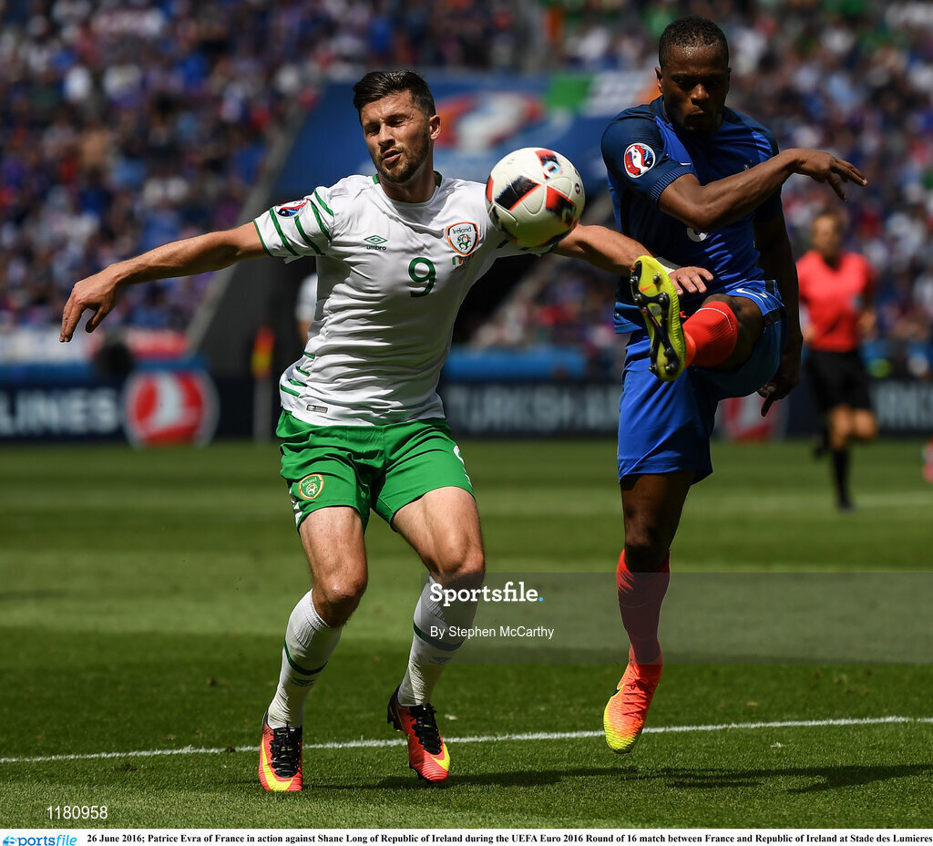 26 June 2016; Patrice Evra of France in action against Shane Long of Republic of Ireland during the UEFA Euro 2016 Round of 16 match between France and Republic of Ireland at Stade des Lumieres in Lyon, France. Photo by Stephen McCarthy/Sportsfile