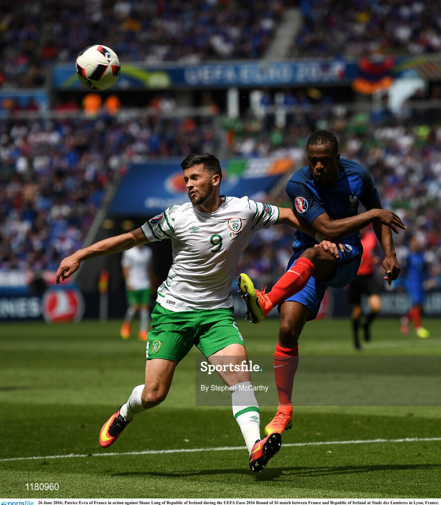26 June 2016; Patrice Evra of France in action against Shane Long of Republic of Ireland during the UEFA Euro 2016 Round of 16 match between France and Republic of Ireland at Stade des Lumieres in Lyon, France. Photo by Stephen McCarthy/Sportsfile