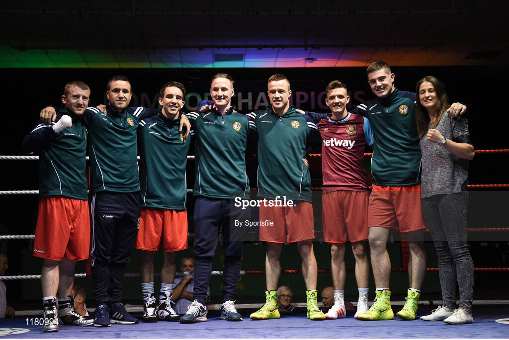 2 July 2016; The Ireland boxers, from left, Paddy Barnes, David Joyce, Michael Conlan, Michael O'Reilly, Steven Donnelly, Brendan Irvine, Joe Ward, and Katie Taylor, who will be competing at Rio Olympics 2016 in the ring following a Boxing Test Match event between Ireland and Russia at The National Stadium in Dublin. Photo by Sportsfile