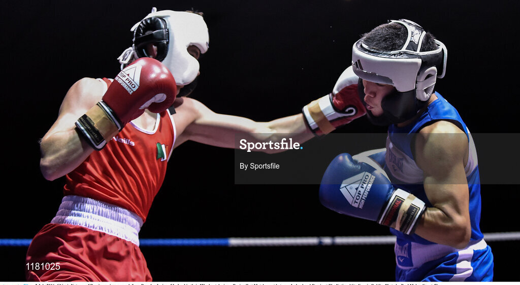 2 July 2016; Chingiz Natyrov of Russia receives a punch from Brendan Irvine of Ireland in their 52kg bout during a Boxing Test Match event between Ireland and Russia at The National Stadium in Dublin. Photo by Sportsfile
