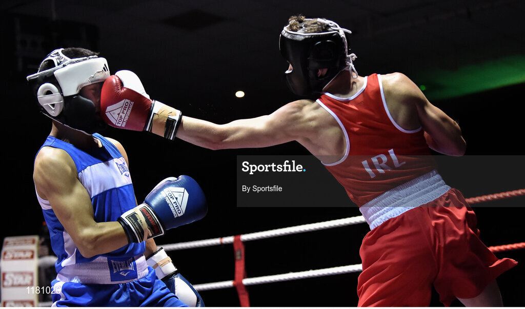 2 July 2016; Brendan Irvine of Ireland, right, exchanges punches with Chingiz Natyrov of Russia in their 52kg bout during a Boxing Test Match event between Ireland and Russia at The National Stadium in Dublin. Photo by Sportsfile