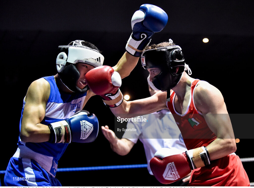 2 July 2016; Brendan Irvine of Ireland, right, exchanges punches with Chingiz Natyrov of Russia in their 52kg bout during a Boxing Test Match event between Ireland and Russia at The National Stadium in Dublin.