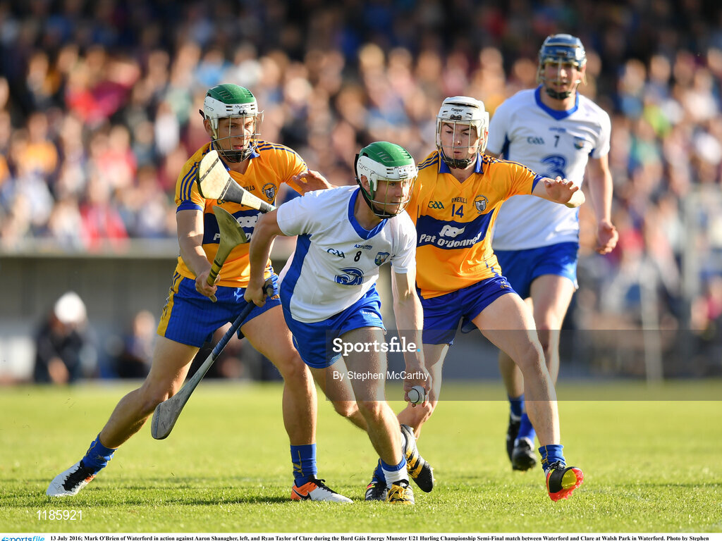 13 July 2016; Mark O'Brien of Waterford in action against Aaron Shanagher, left, and Ryan Taylor of Clare during the Bord Gáis Energy Munster U21 Hurling Championship Semi-Final match between Waterford and Clare at Walsh Park in Waterford. Photo by Stephen McCarthy/Sportsfile