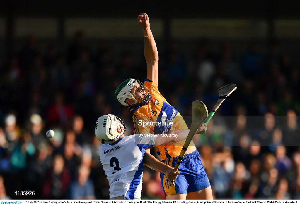 13 July 2016; Aaron Shanagher of Clare in action against Conor Gleeson of Waterford during the Bord Gáis Energy Munster U21 Hurling Championship Semi-Final match between Waterford and Clare at Walsh Park in Waterford. Photo by Stephen McCarthy/Sportsfile