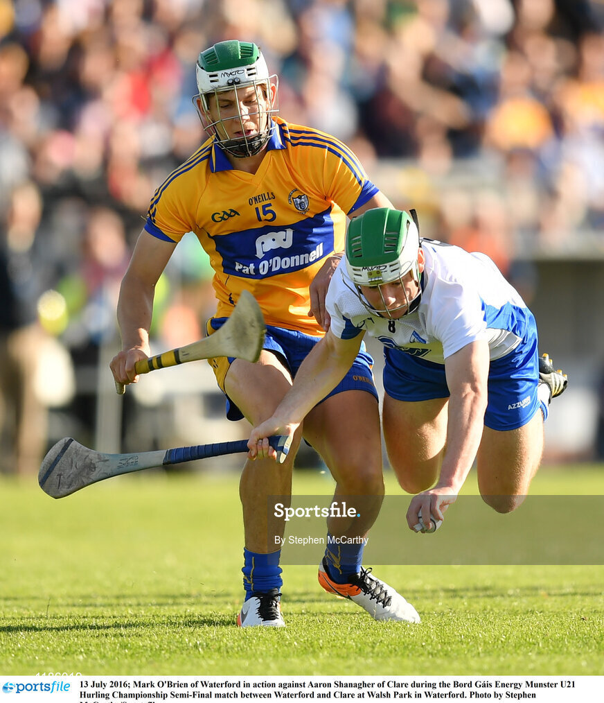 13 July 2016; Mark O'Brien of Waterford in action against Aaron Shanagher of Clare during the Bord Gáis Energy Munster U21 Hurling Championship Semi-Final match between Waterford and Clare at Walsh Park in Waterford. Photo by Stephen McCarthy/Sportsfile