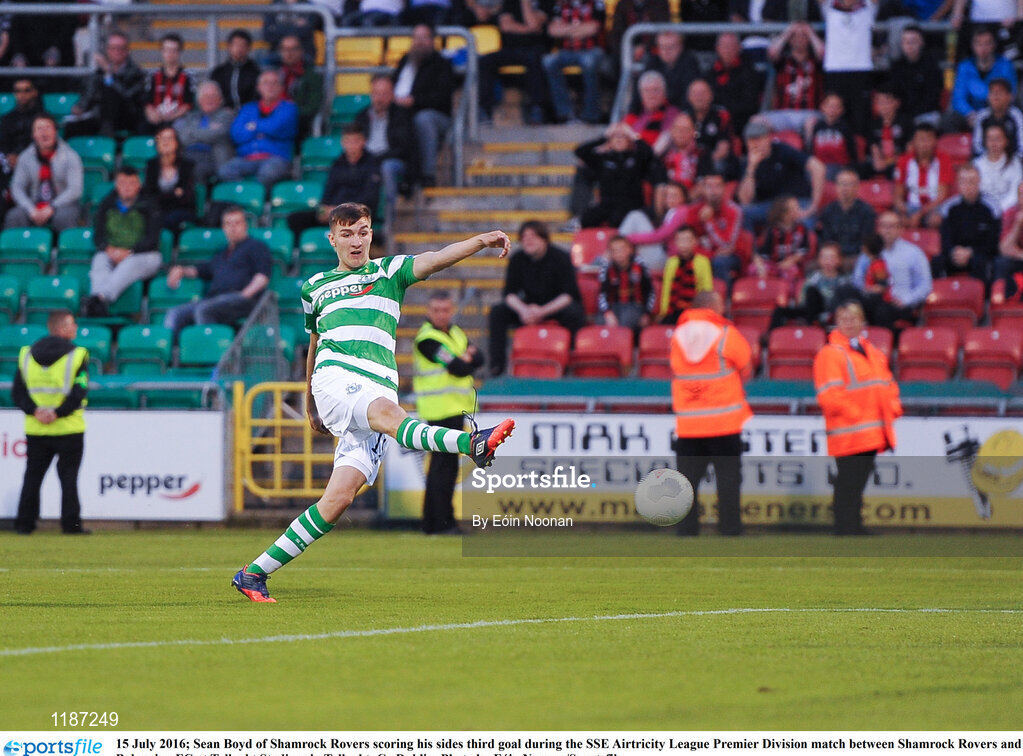 15 July 2016; Sean Boyd of Shamrock Rovers scoring his sides third goal during the SSE Airtricity League Premier Division match between Shamrock Rovers and Bohemian FC at Tallaght Stadium in Tallaght, Co Dublin. Photo by Eóin Noonan/Sportsfile
