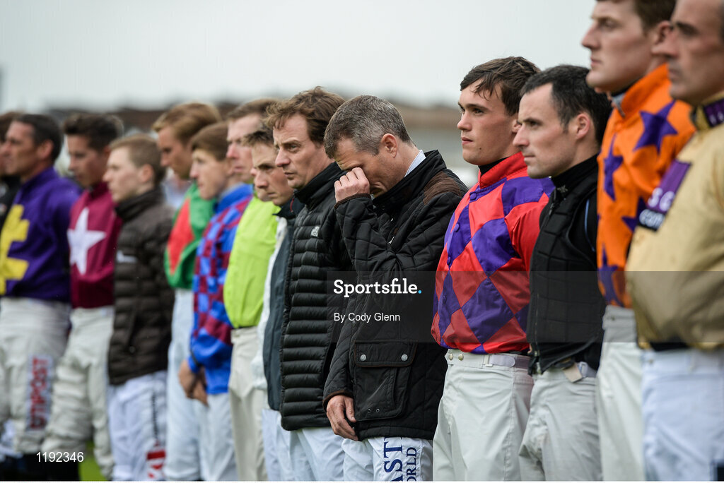 26 July 2016; Pat Smullen, centre, and fellow jockeys observe a minute of silence for the late jockey John Thomas McNamara after race one at the Galway Races in Ballybrit, Co Galway. Photo by Cody Glenn/Sportsfile