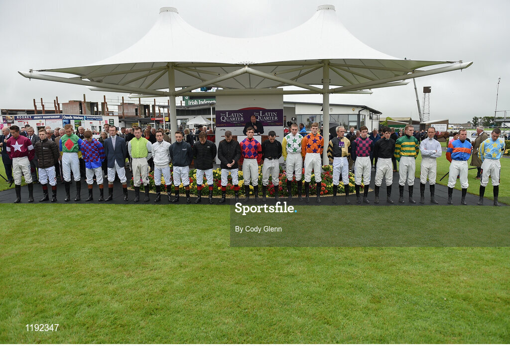 26 July 2016; Jockeys observe a minute silence for the late jockey John Thomas McNamara after race one at the Galway Races in Ballybrit, Co Galway. Photo by Cody Glenn/Sportsfile