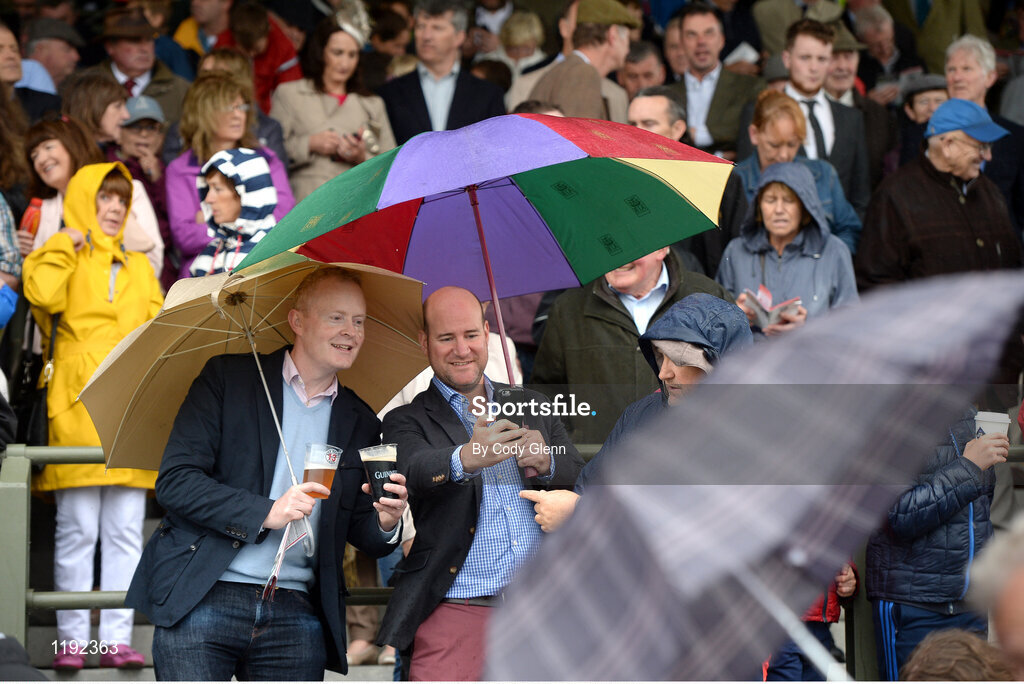 26 July 2016; Brian Osborne, left, from Galway City, and Jeremy O'Connor, from Douglas, Co Cork, snap a selfie under the shelter of their umbrellas at the Galway Races in Ballybrit, Co Galway. Photo by Cody Glenn/Sportsfile
