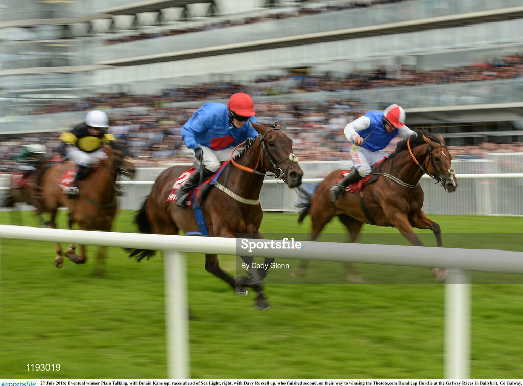 27 July 2016; Eventual winner Plain Talking, with Briain Kane up, races ahead of Sea Light, right, with Davy Russell up, who finished second, on their way to winning the Thetote.com Handicap Hurdle at the Galway Races in Ballybrit, Co Galway. Photo by Cody Glenn/Sportsfile