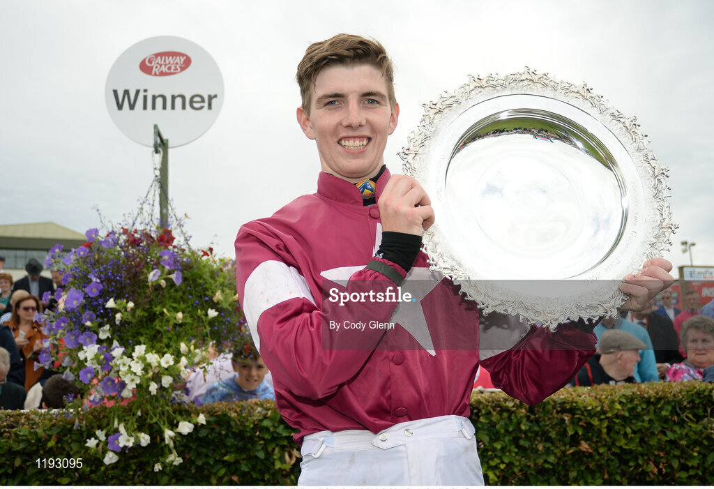 27 July 2016; Donagh Meyler celebrates with the Galway Plate after winning the TheTote.com Galway Plate Steeplechase Handicap at the Galway Races in Ballybrit, Co Galway. Photo by Cody Glenn/Sportsfile