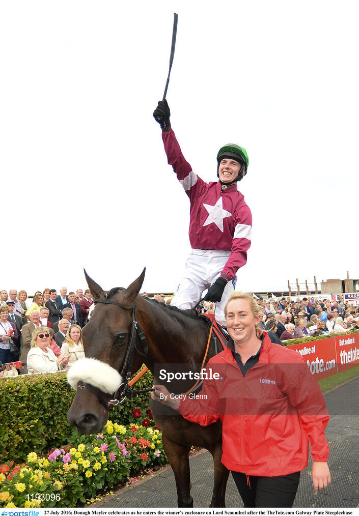 27 July 2016; Donagh Meyler celebrates as he enters the winner's enclosure on Lord Scoundrel after the TheTote.com Galway Plate Steeplechase Handicap at the Galway Races in Ballybrit, Co Galway. Photo by Cody Glenn/Sportsfile