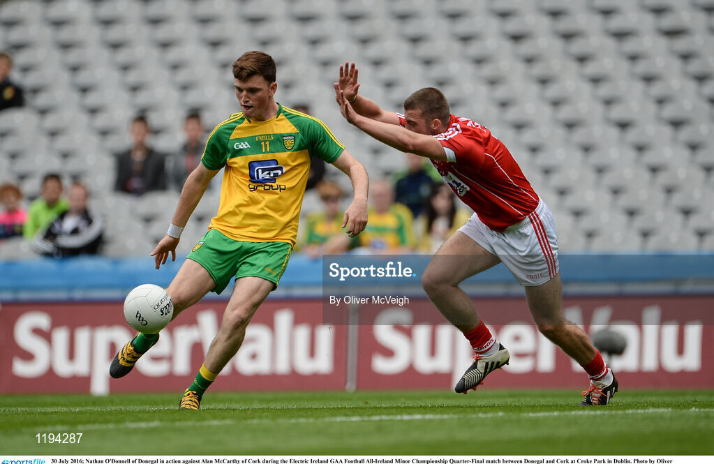 30 July 2016; Nathan O'Donnell of Donegal in action against Alan McCarthy of Cork during the Electric Ireland GAA Football All-Ireland Minor Championship Quarter-Final match between Donegal and Cork at Croke Park in Dublin. Photo by Oliver McVeigh/Sportsfile