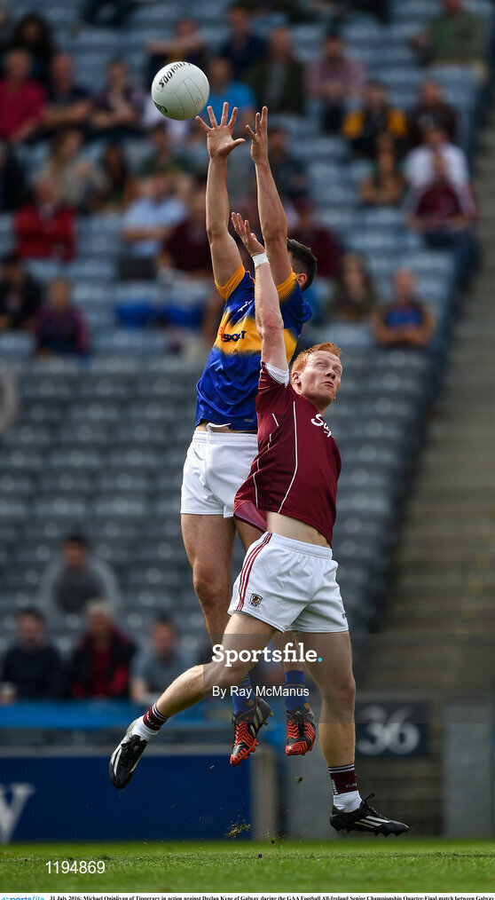 31 July 2016; Michael Quinlivan of Tipperary in action against Declan Kyne of Galway during the GAA Football All-Ireland Senior Championship Quarter-Final match between Galway and Tipperary at Croke Park in Dublin. Photo by Ray McManus/Sportsfile