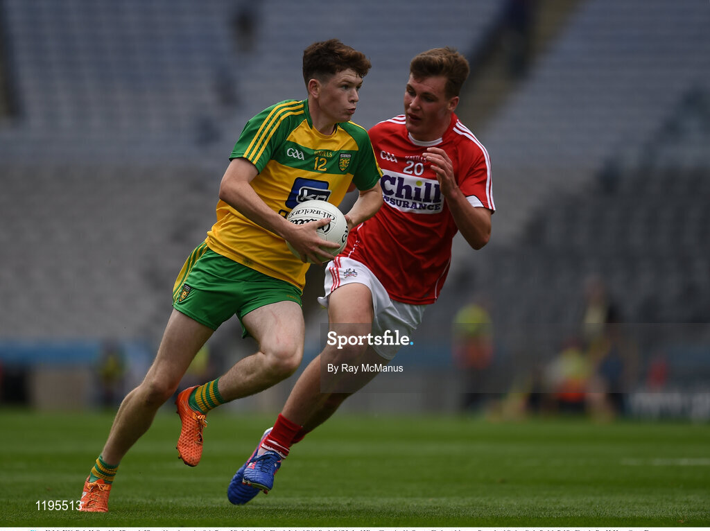 30 July 2016; Enda McCormick of Donegal of Donegal in action against Seán Ryan of Cork during the Electric Ireland GAA Football All-Ireland Minor Championship Quarter-Final match between Donegal and Cork at Croke Park in Dublin. Photo by Ray McManus/Sportsfile