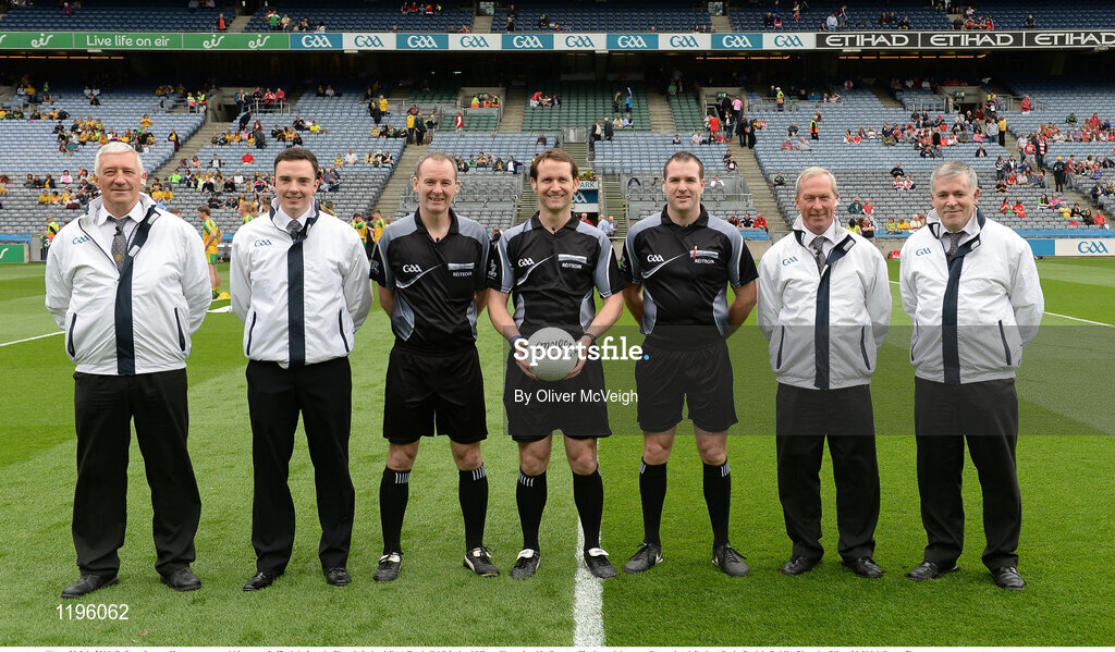 30 July 2016; Referee Jerome Henry, centre, and his team of officials before the Electric Ireland GAA Football All-Ireland Minor Championship Quarter-Final match between Donegal and Cork at Croke Park in Dublin. Photo by Oliver McVeigh/Sportsfile
