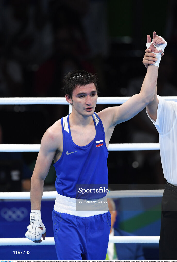 7 August 2016; Adlan Abdurashidov of Russia celebrates after defeating Thadius Katua of Papua New Guinea in their 60kg bout in the Riocentro Pavillion 6 Arena, Barra da Tijuca, during the 2016 Rio Summer Olympic Games in Rio de Janeiro, Brazil. Photo by Ramsey Cardy/Sportsfile