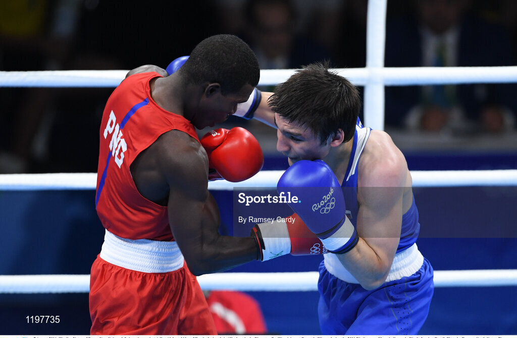 7 August 2016; Thadius Katua of Papua New Guinea, left, in action against Adlan Abdurashidov of Russia during their 60kg bout in the Riocentro Pavillion 6 Arena, Barra da Tijuca, during the 2016 Rio Summer Olympic Games in Rio de Janeiro, Brazil. Photo by Ramsey Cardy/Sportsfile