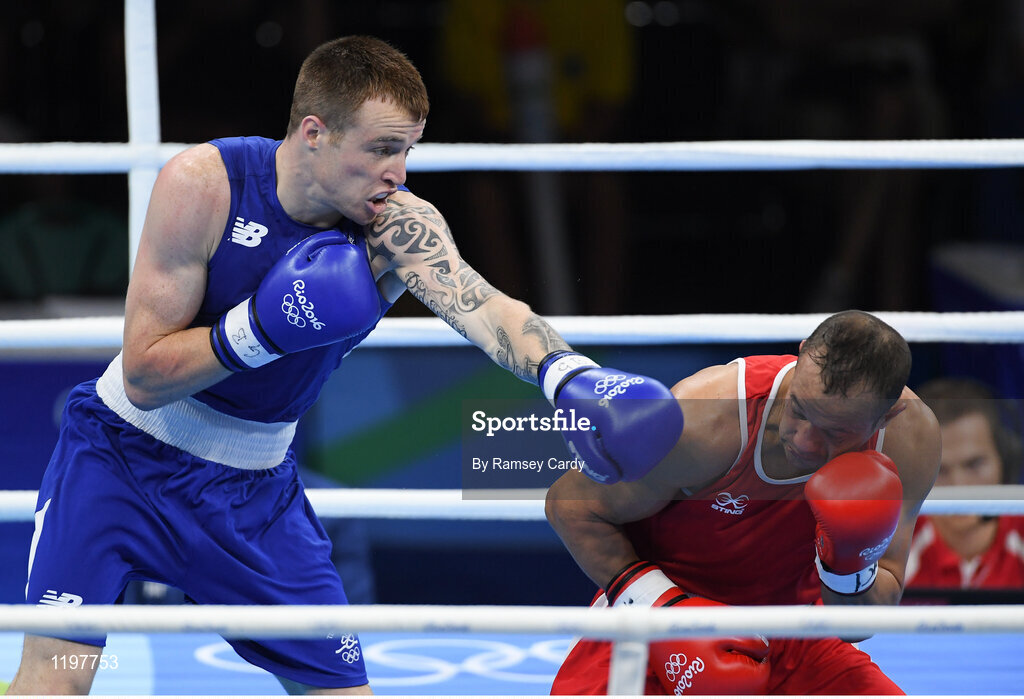 7 August 2016; Steven Donnelly of Ireland, left, in action against Zohir Kedache of Algeria during their Welterweight preliminary round of 32 bout in the Riocentro Pavillion 6 Arena, Barra da Tijuca, during the 2016 Rio Summer Olympic Games in Rio de Janeiro, Brazil. Photo by Ramsey Cardy/Sportsfile